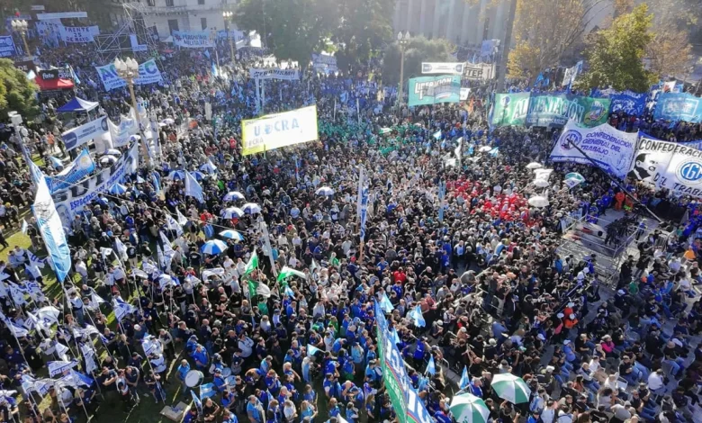 Luego fue el turno de Jerónimo, quien reivindicó el comportamiento de la central obrera ante las críticas de otros sectores : “A quienes nos critican, esta CGT siempre estuvo al frente de esta lucha, a los 15 dias de este gobierno hizo el primer paro general”.